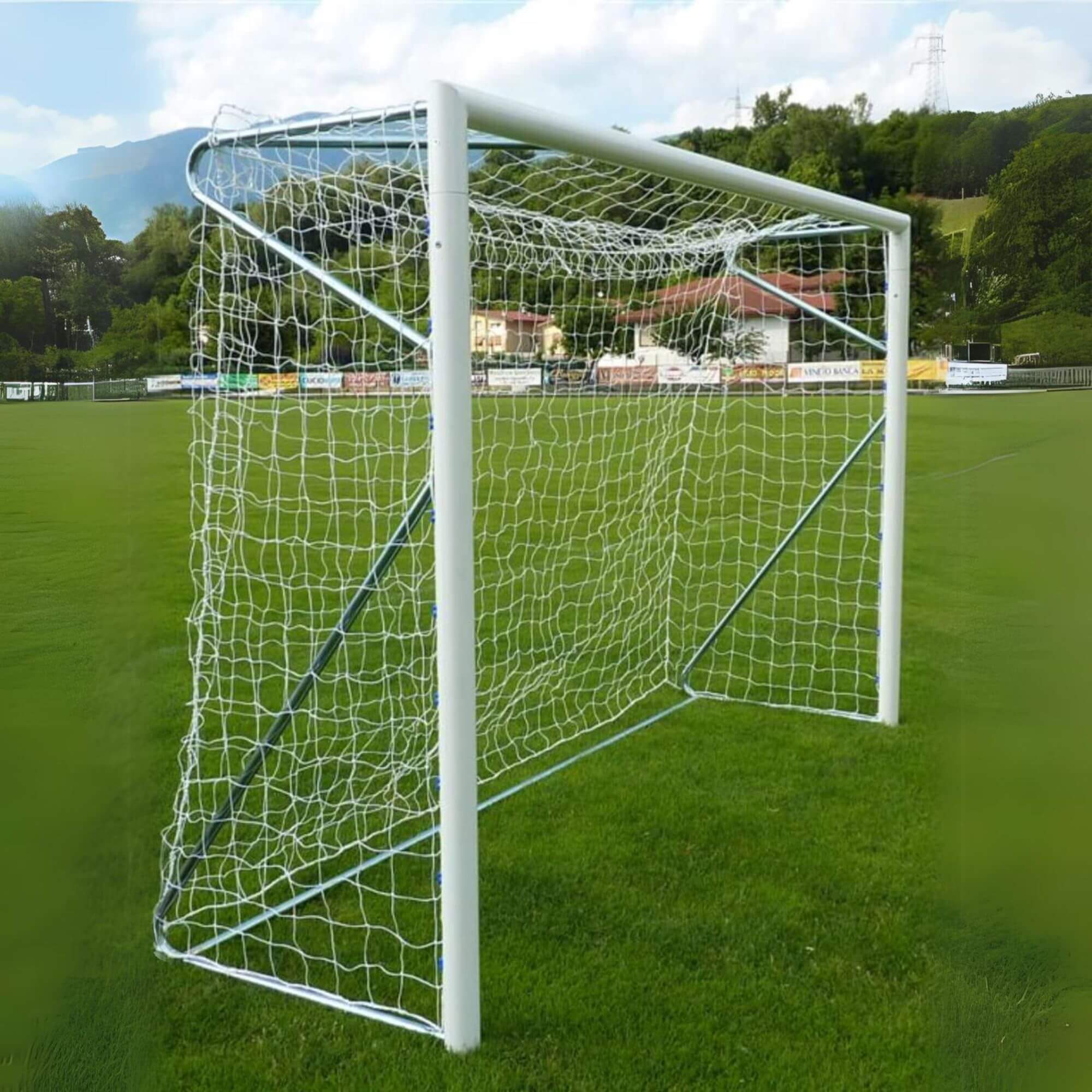 Porta fotbal realizata din profil rotund de aluminiul, acoperita cu vopsea poliuretanica.